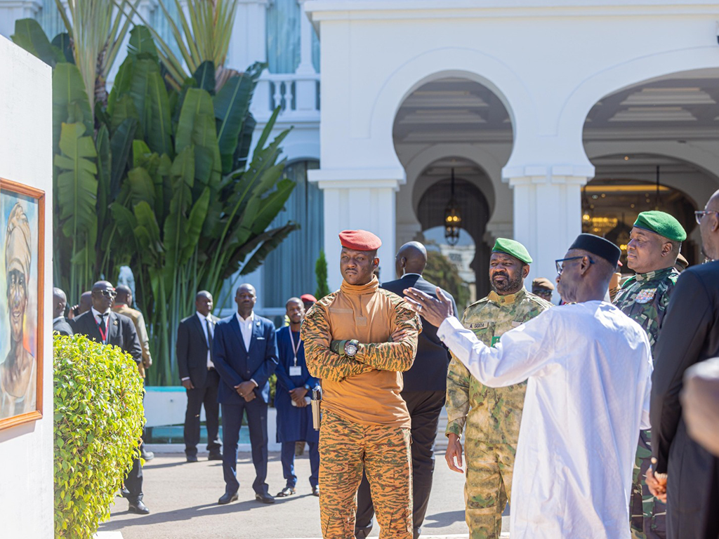 Finally, the presentation of official portraits of the Sahelian Heads of State, created by the artist, underscores the recognition of these leaders’ essential role in regional unity.